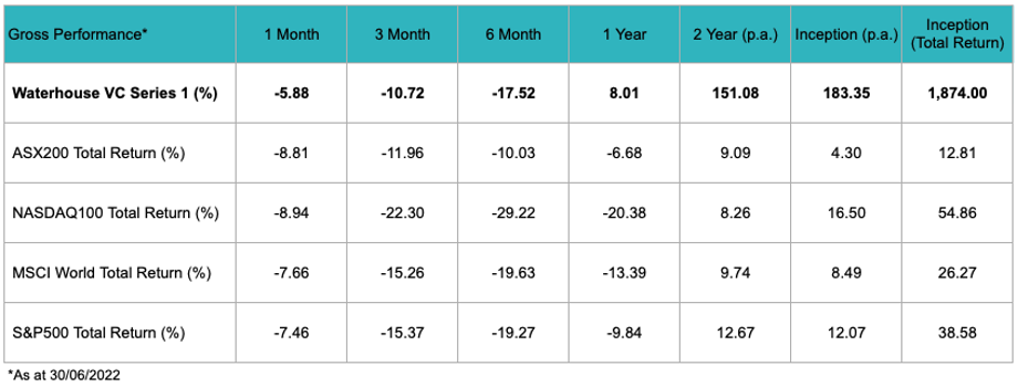 Since inception in August 2019, Waterhouse VC has achieved a total return of 1,874% as at 30 June 2022, assuming the reinvestment of all distributions. See our long-term performance table below.