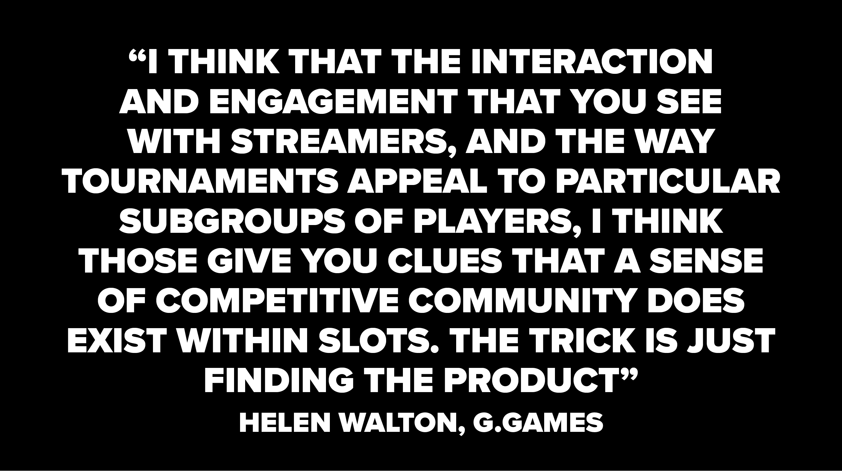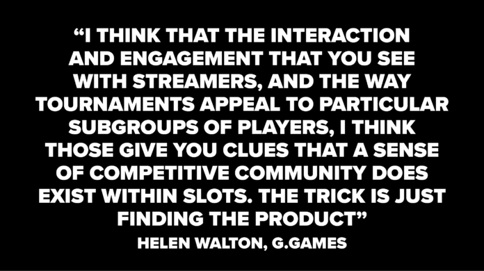 “They say, ‘People just like luck, like pressing the button; they like the fact that they are not in control’. But I think that the interaction and engagement that you see with streamers, and the way tournaments appeal to particular subgroups of players, I think those give you clues that a sense of competitive community does exist within slots. The trick is just finding the product.”