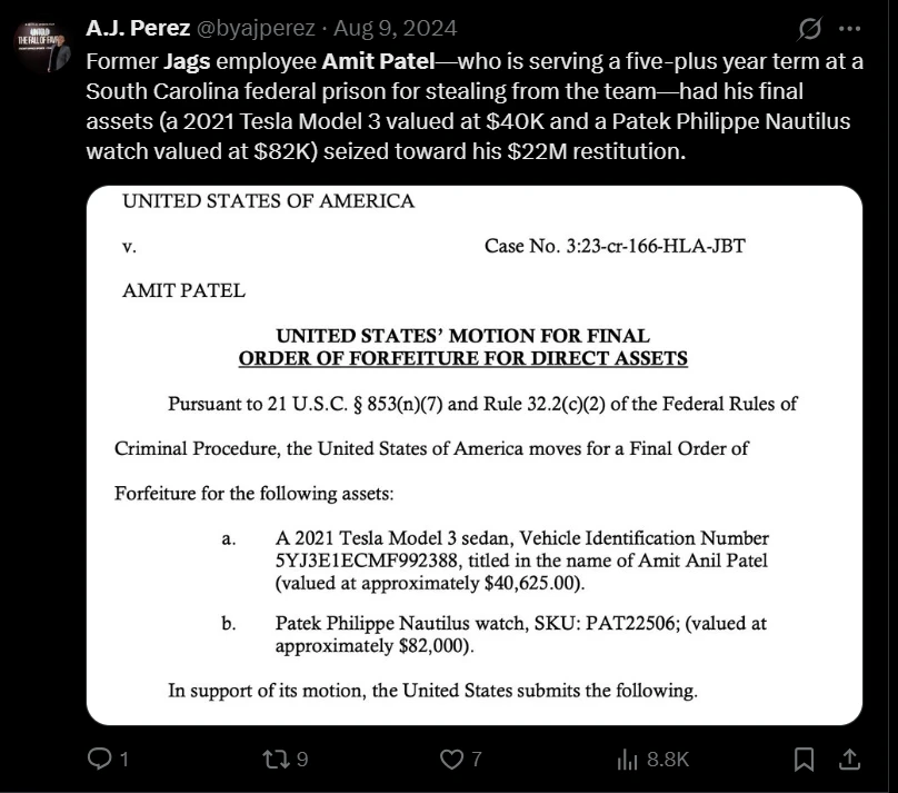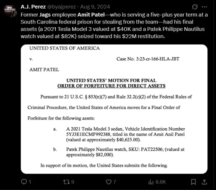 Amit Patel, a former Jaguars executive, pleaded guilty in 2023 to misappropriating $22 million from the team’s Virtual Credit Card (VCC) program in a brazen bid to fuel his gambling habit. Patel, who served as the sole custodian of the team’s VCC system, received a 78-month prison sentence last year on several charges, including wire fraud.