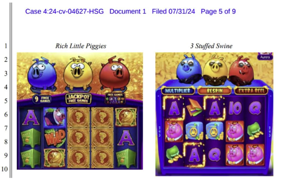 So, as names go, there is plenty of duplication, though not in the California case. What seems to have hit a nerve here are the imagery and/or game mechanic similarities. Piggy graphics tend to be similar, not least as the subtheme of three little pigs dates back to old nursery tales (see top graphic). A graphic filed as part of the L&W case though (and reproduced by sbcnews) seems to support the description of ‘blatant imitation’.