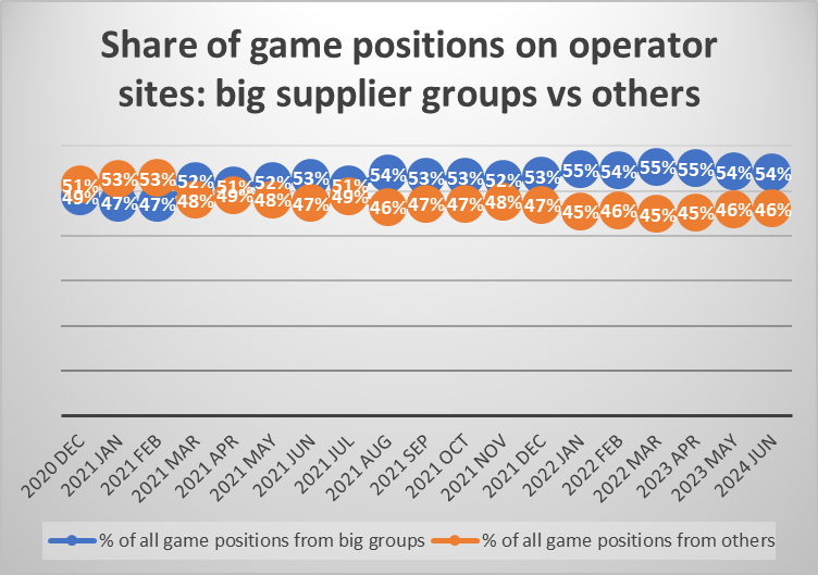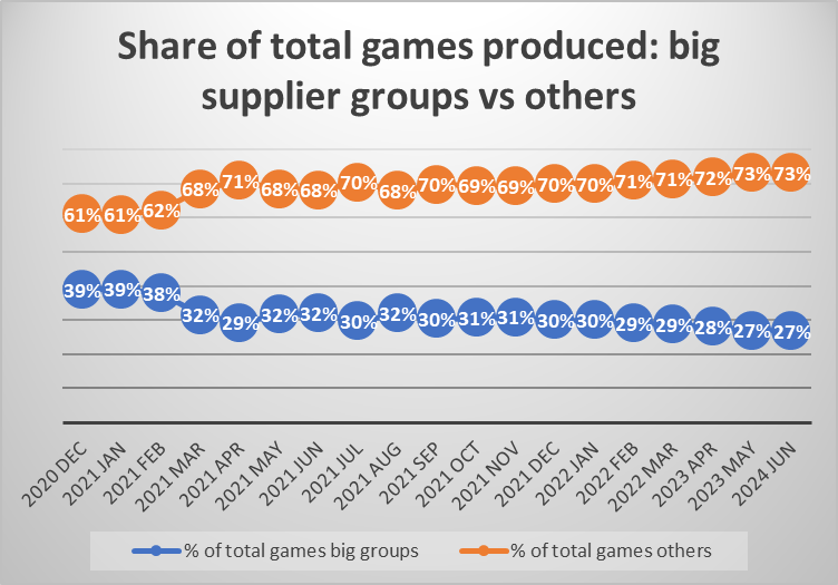 The great influx of new studios has meant that of the big suppliers we’re focused on here, their share of total game content available has declined from around 32% to 27%. In keeping with the overall consolidation picture, however, their share of ‘shelf space’, or their percentage of all games found across all game pages in contrast, has increased from 49% to 54%.