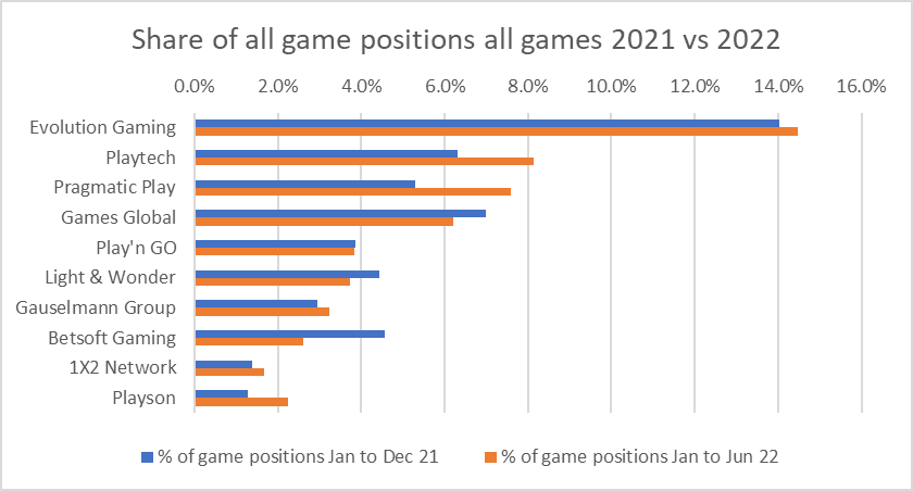 In the context of relentless market growth over the last 20 years, it’s easy to pat ourselves on the back when many of our charts are all heading up and to the right. But are some growing faster than their peers? Our third chart below shows how Pragmatic Play and Playtech have tended to outperform some of the other larger competitors in terms of their improvement in ‘shelf-share’ visibility of all games this year.