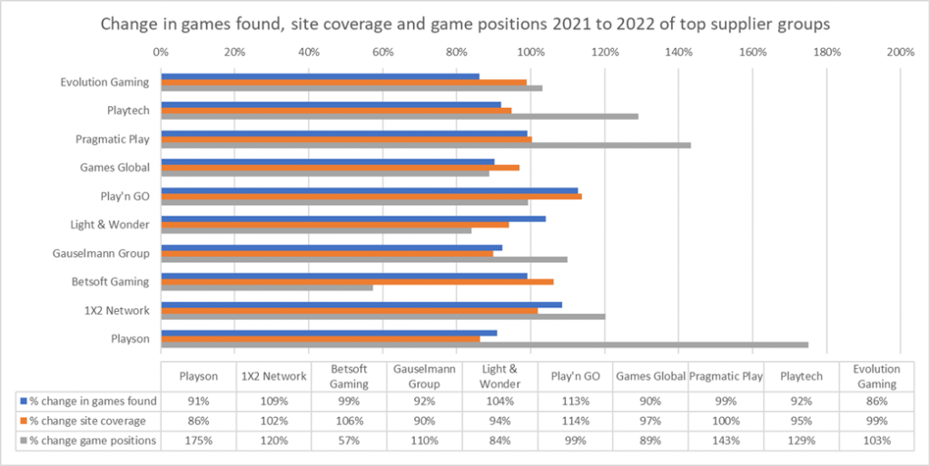 Play’n Go opened their product pipeline up more than most and have also managed to secure more site distribution in recent months. Echoing the percentage shares chart earlier, Pragmatic Play and Playtech (plus also Playson from a lower base) have outperformed many in the leading pack in terms of shelf space improvement.