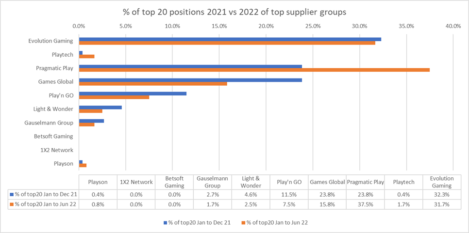 In brief, all three groups continue to dominate the charts yet Pragmatic Play have performed better over the last year – that is, if the objective is to secure a larger percentage of the top spots. Note that top positions as per our charts are based on the number of times a game is found across the universe of 2,000+ operator sites.
