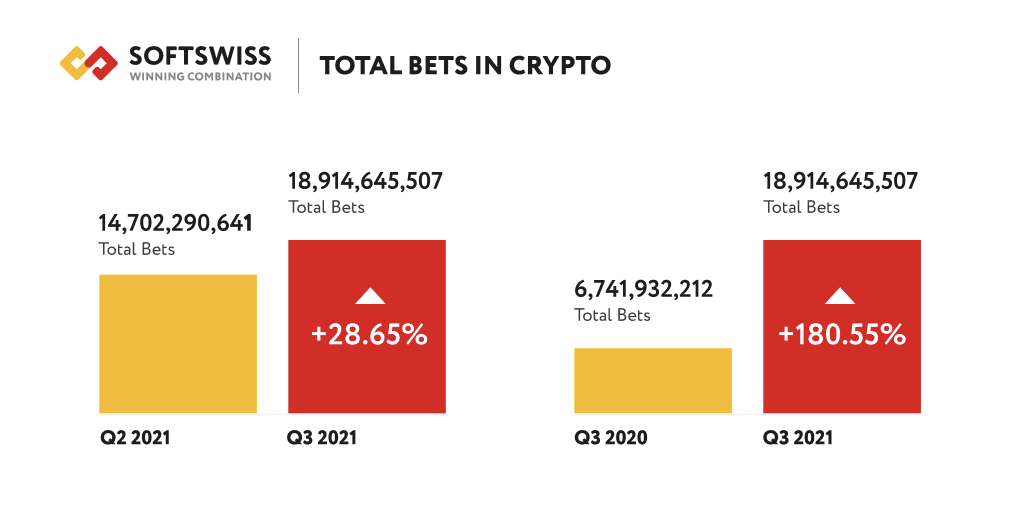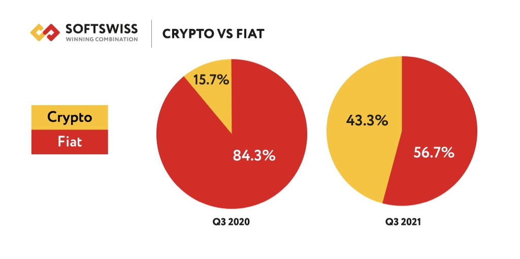 In Q3 2021, the total number of bets placed using cryptocurrency increased by 181% yoy, while the share of bets in crypto (43.3%) is fast approaching par with fiat (source: Softswiss).