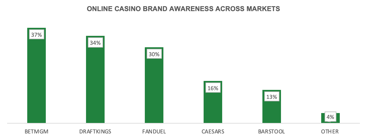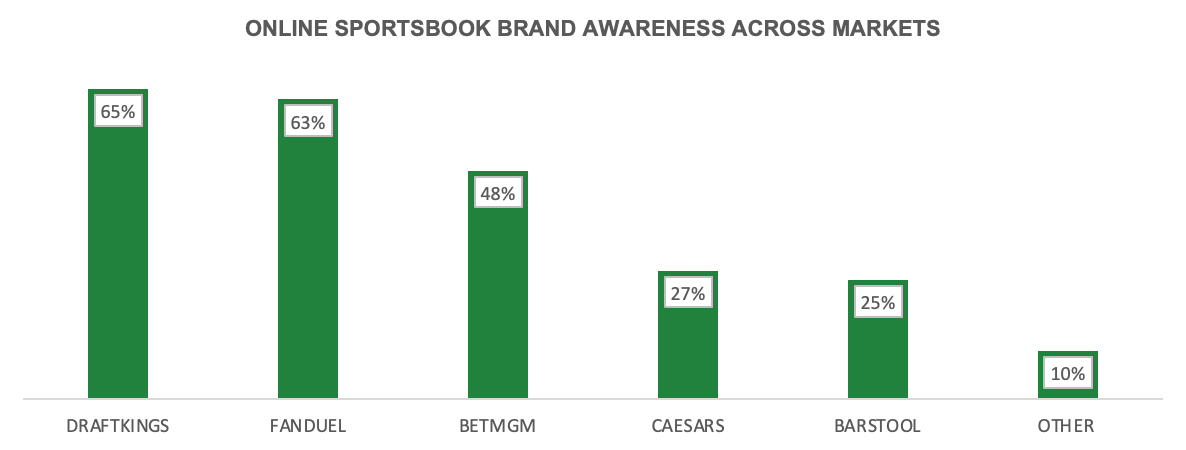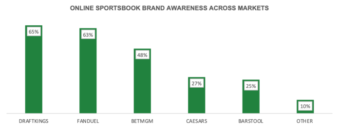 DraftKings ranked first for online sportsbook awareness and second for online casino awareness. FanDuel ranked second and third respectively. In both categories, Caesars and Barstool ranked fourth and fifth, respectively.