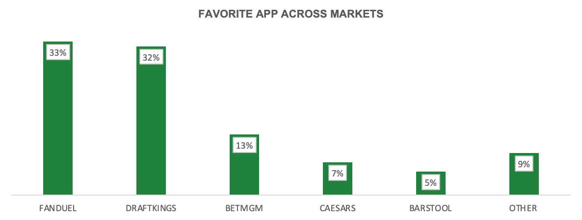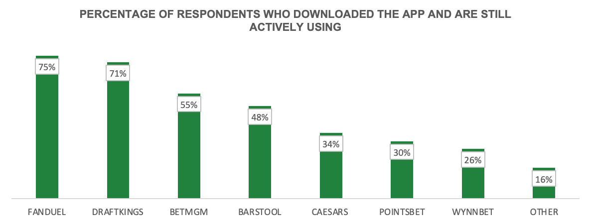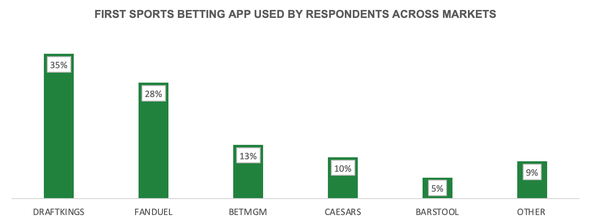 This is in comparison to the 28% of respondents that listed FanDuel as their first app used, but 33% that listed it as their favourite (a net win to FanDuel of +8 percentage points when compared to its biggest rival).