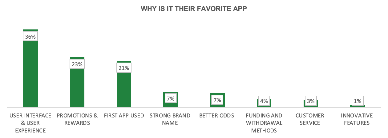 Unsurprisingly when analysing this cohort of bettors’ app preferences, user interface and user experience were most important in deciding users’ favourite app (36%) – the category in which FanDuel happens to rank highest.
