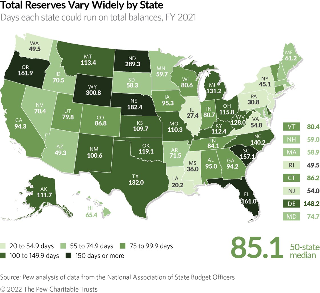 The Pew Charitable Trusts then calculated how long each state could operate under existing balances, as outlined in the map below.