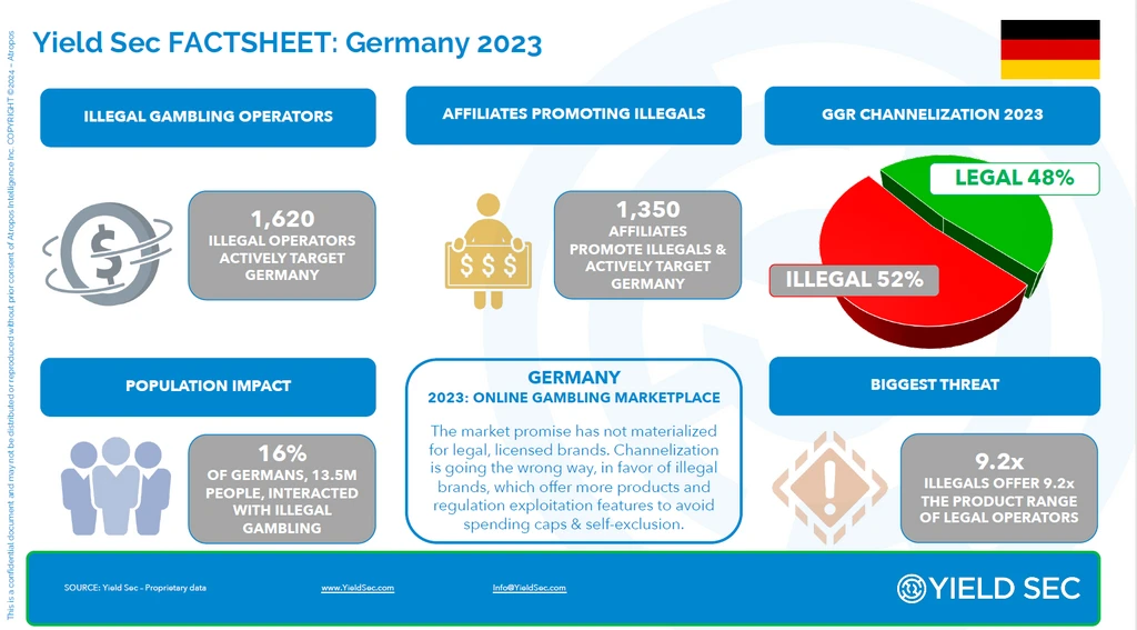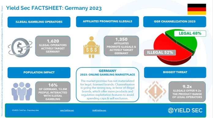 Most recently, Yield Sec charted an 11% growth in the illegal market in Germany, giving it a 47% share of the total marketplace for online betting and gambling, compared to 53% legal.