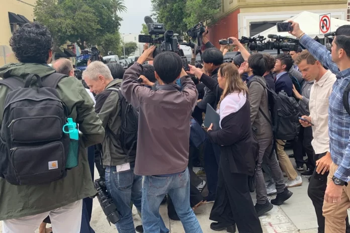 More than 100 media members were outside the courthouse and inside the court room, temporarily clogging Santa Ana’s 4th Street. Mizuhara spoke only in the court room and in response to Holcomb’s questions. His attorney, Michael Freedman, declined to comment despite the pair being literally surrounded by media as they exited the courthouse.