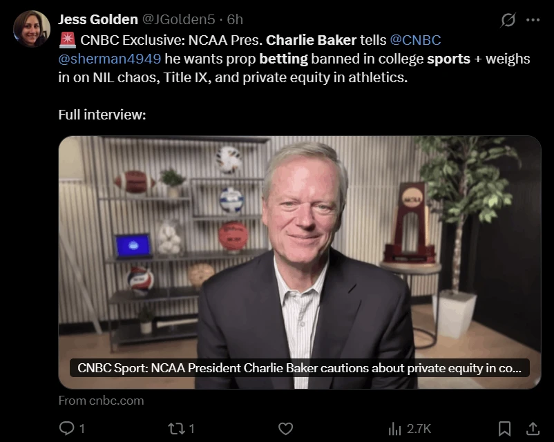 Last December, NCAA President Charlie Baker testified before the Senate Judiciary Committee’s federal hearing on sports betting. Baker, former governor of Massachusetts, has lobbied states with legal sports gambling to prohibit prop bets involving college athletes. Baker reiterated his push for restrictions on props earlier this week.