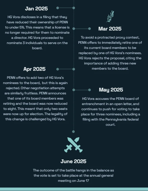 In May, HG Vora filed a lawsuit against Penn accusing the company of violating Pennsylvania Business Corporation law. The suit also accuses Penn of breaching its fiduciary duty by reducing the number of seats available on the board. In response, Penn filed a motion to stay, urging a Pennsylvania court to temporarily halt legal proceedings. According to Penn, the merits of HG Vora’s claim do not “constitute good cause”.