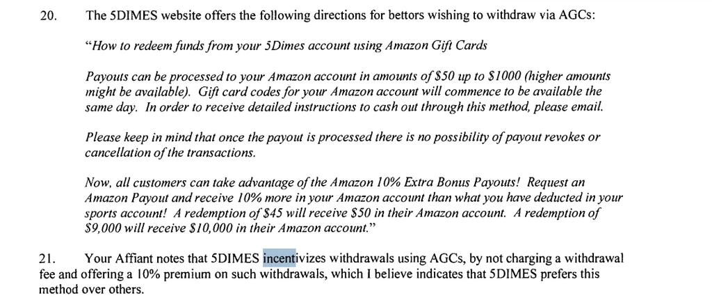 As part of the investigation, federal authorities determined that the offshore book designed incentives for customers to utilise Amazon gift cards as a withdrawal vehicle, while offering a 10% premium for selecting the method.
