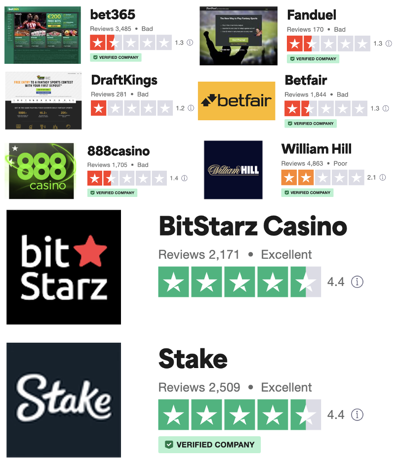 The below selection of Trustpilot scores demonstrates players’ preference for newer crypto operators – represented by Stake.com and BitStarz Casino – over mature fiat operators.
