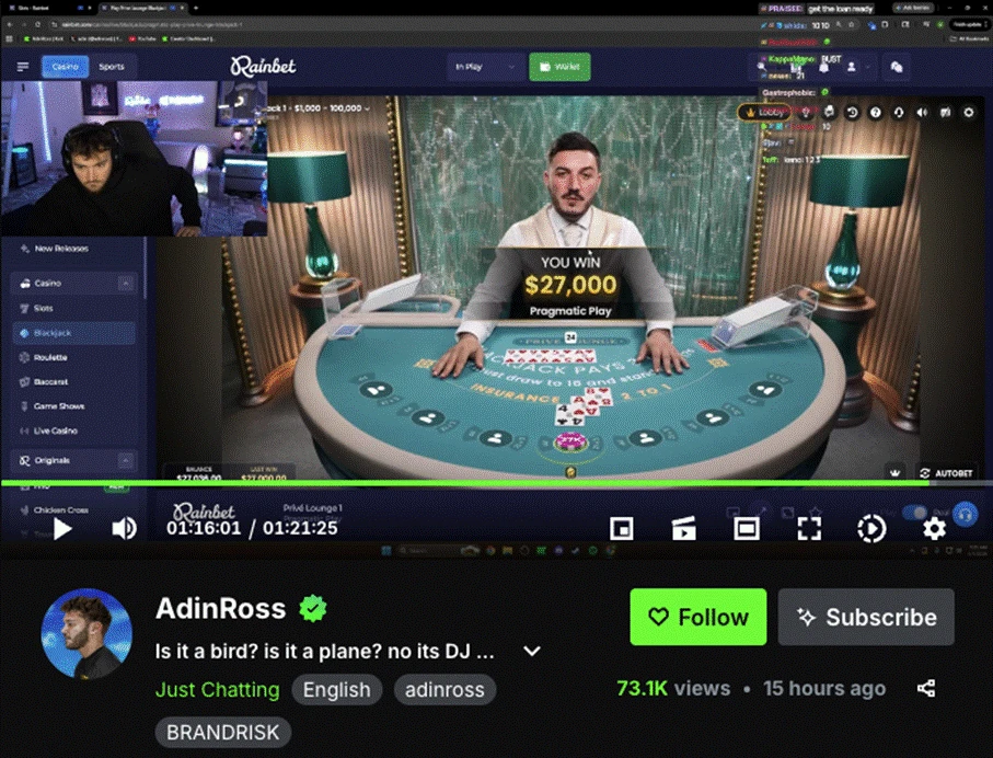Popular streamer Adin Ross playing blackjack to his audience on Kick. Source: Kick