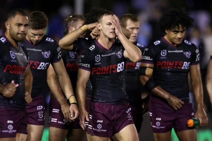 PointsBet branding on Manly Sea Eagles jerseys. Under the announced reforms, gambling logos on uniforms will be banned from 2027. Source: Cameron Spencer/Getty Images