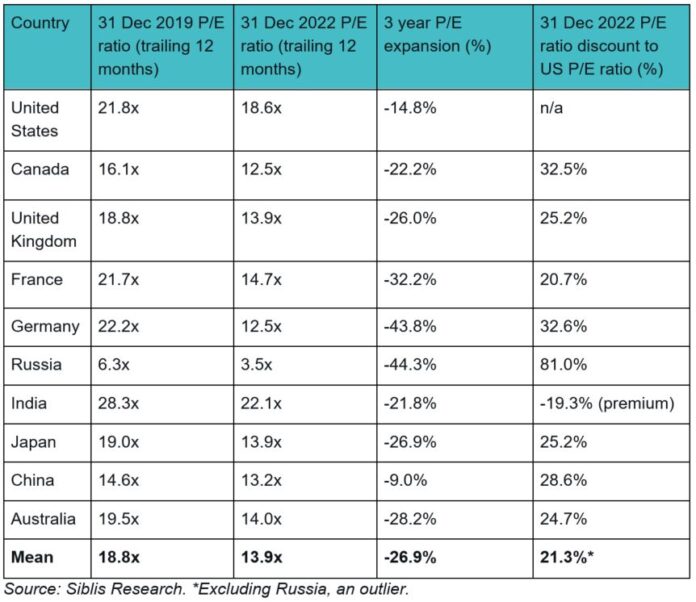 The table below shows the P/E ratios of the largest global markets, calculated using the benchmark equity index of each stock market.