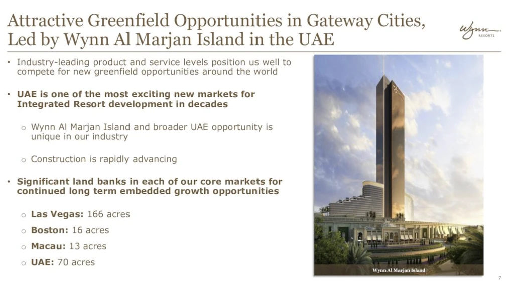 Various estimates have placed the total addressable market in Dubai in the range of $5 billion to $8 billion a year. Wynn Al Marjan Island will be the company’s first new project under its current management team. Consequently, the Dubai project is the company’s top priority at the moment, Billings explained.