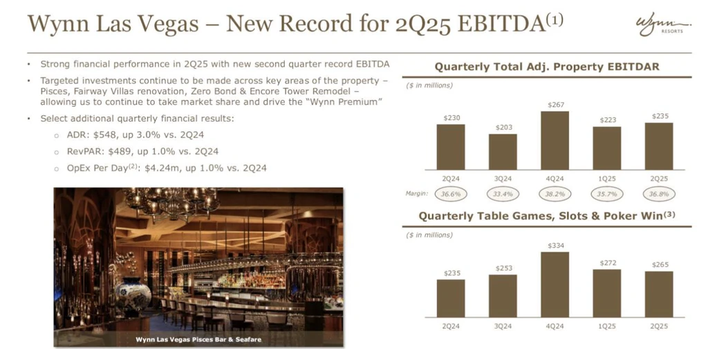 During Wynn’s second quarter of 2025, the average daily rate for its Las Vegas hotels came in at $548, up 3% year-over-year. The metric is viewed as a key indicator for earned revenue based on occupancy levels at Strip properties. In addition, Wynn Resorts CEO Craig Billings appears pleased with metrics on table game and slot machines, as well as receipts at luxury restaurants at Wynn’s Vegas properties.