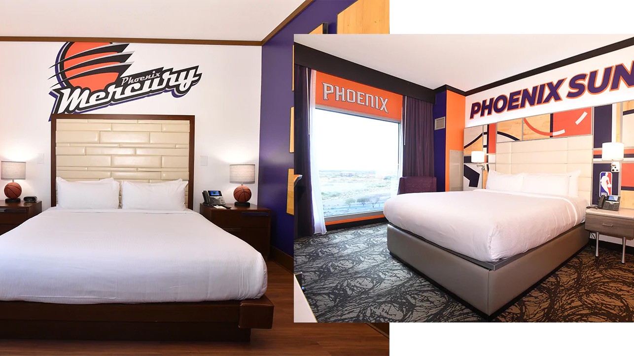Also part of the deal, Gila River has made themed hotel rooms for the Suns and the Mercury, like it has done with other sports entities. The Suns room is at Gila River’s Wild Horse Pass and the Mercury is at the Vee Quiva resort. Both rooms are decorated with autographed memorabilia and design elements mirroring the downtown arena.