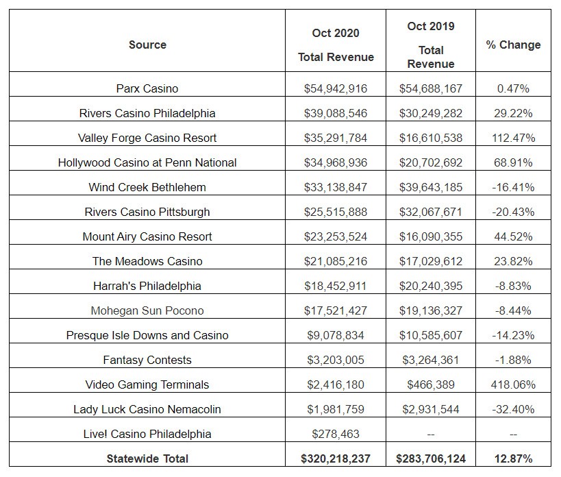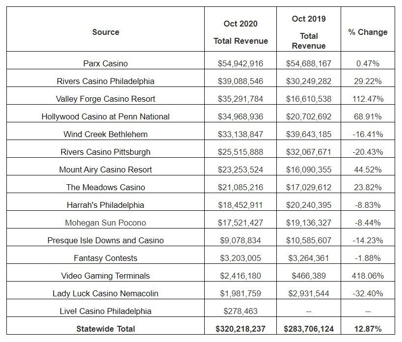 Total gaming and fantasy contests revenue generated in the Commonwealth during October 2020 was $320,218,237 which represents an increase of 12.87% compared to revenue generated in October 2019.