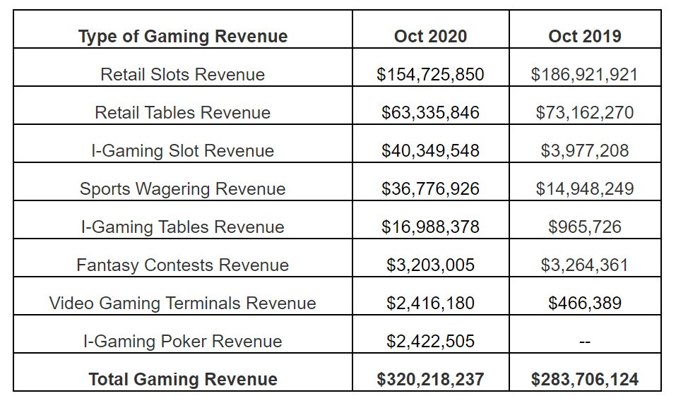 The following chart compiles all revenue generated in October 2020 by casinos along with fantasy contests and video gaming terminals operated by other vendors, and includes a comparison to total revenue generated last October: