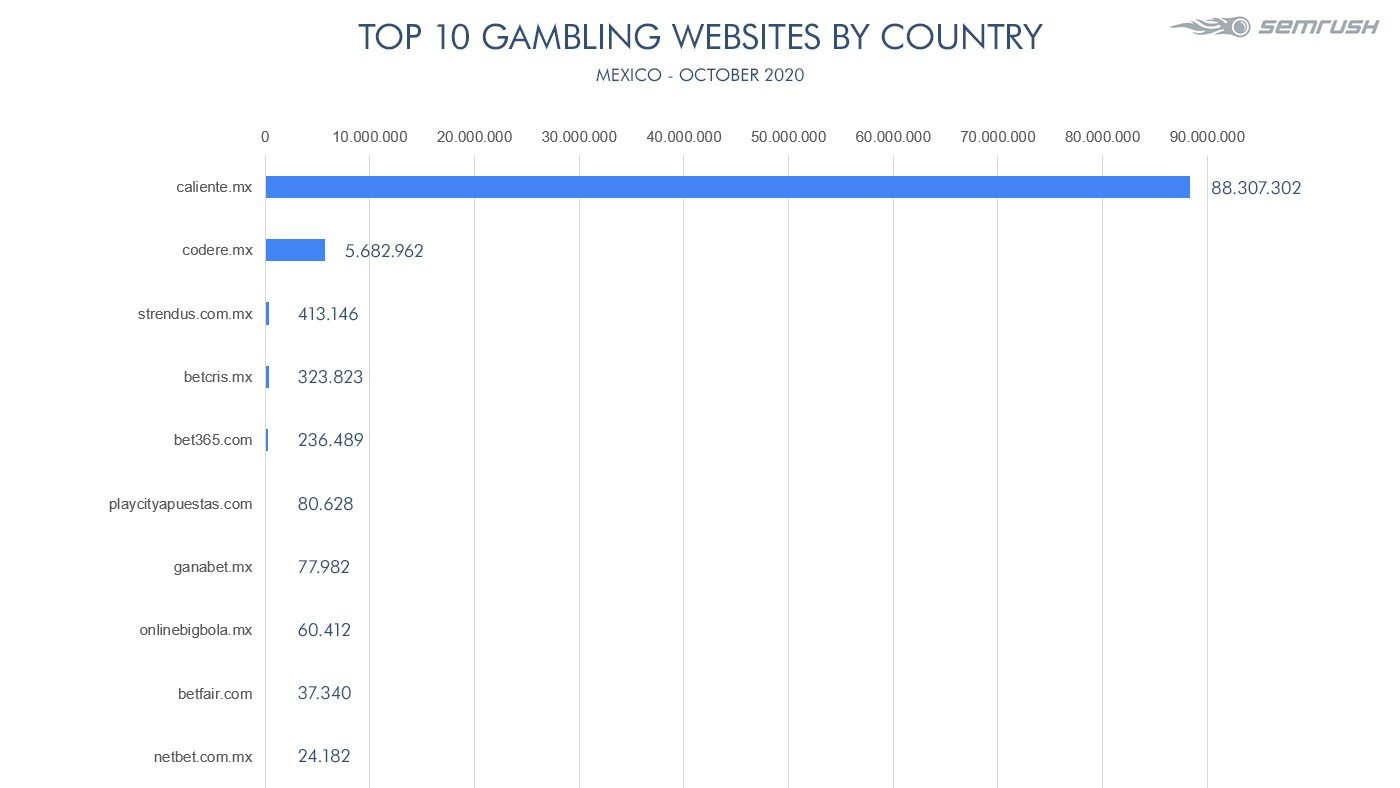 In Mexico, despite seeing a 8% drop in October, Caliente.mx easily kept the first place with 88,307,302 users. Codere.mx soared by 48% and came second though very far, with 5,682,962, while strendus.com.mx achieved the third place with 413,146 users with a 10% growth.