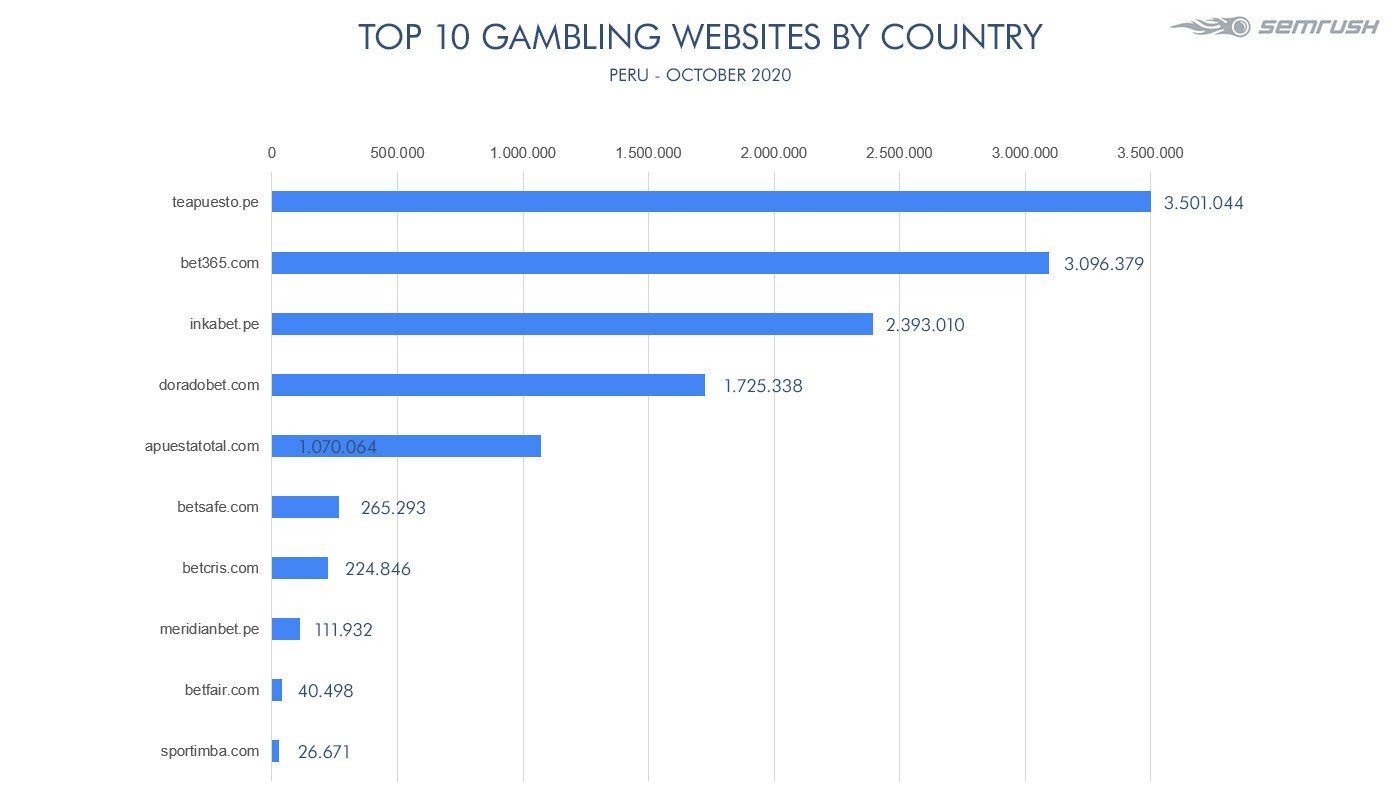In Peru, bet365 took the lead with 3,096,379 users in September, a 25% drop from September. It was followed by teapuesto.pe, which grew by 22% to 3.50 million. Inkabet.pe came third with a 42% monthly drop and 2,393,010 users.