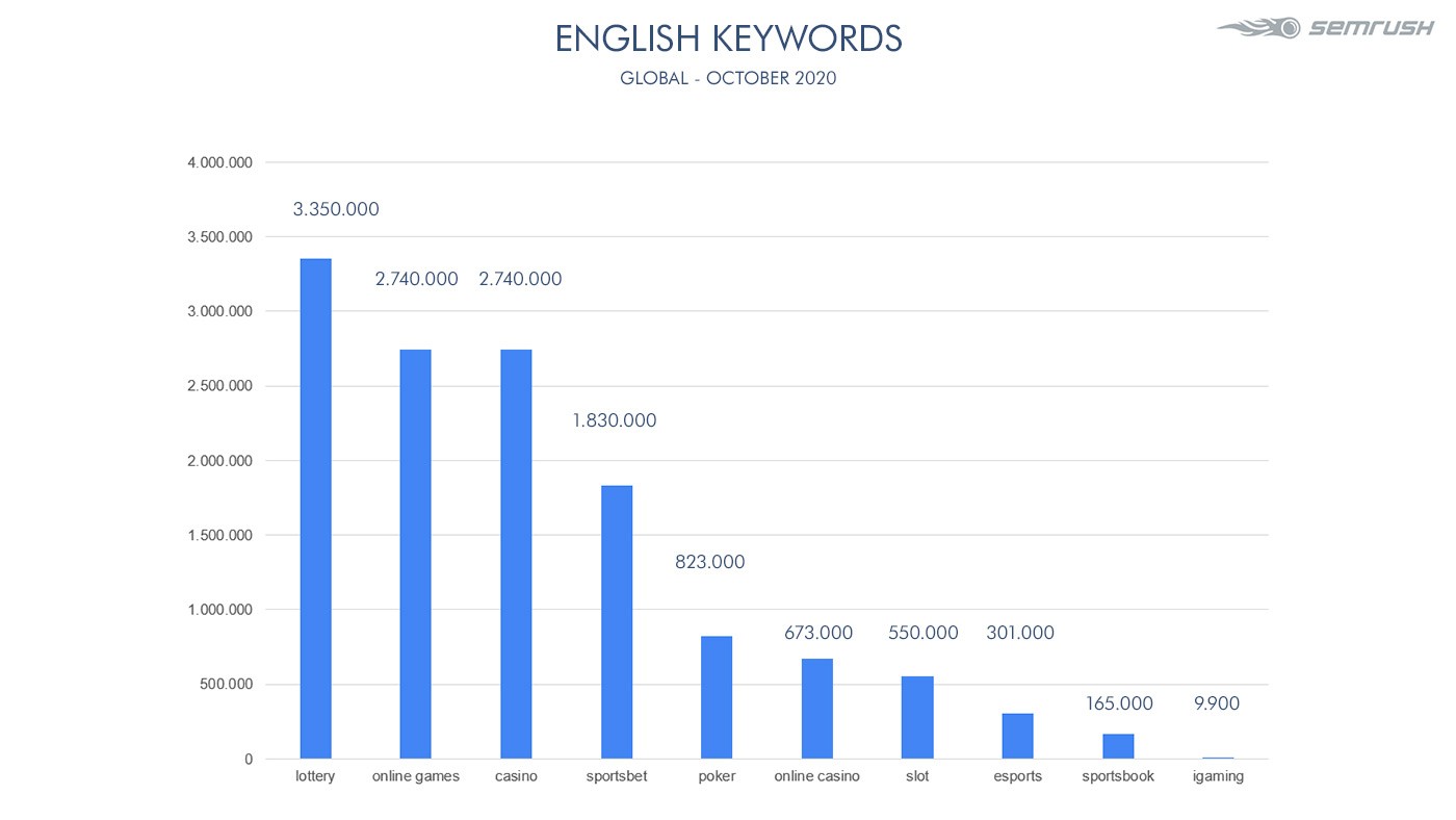 SEMrush also works with search volume data related to the gaming industry, based on the average number of times a specific search query is entered on a search engine per month. The top global English keywords searched in October were “lottery” (3,350,000 times), followed by “online games” (2.740.000), and “casino”, recording 2.740.000 times.