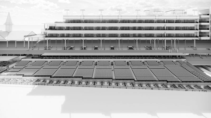 The Homestretch Club will renovate and update the grandstand area adjacent to the Twin Spires along the famed track’s homestretch. The project will convert what is currently outdoor bleacher seating next to the Winner’s Circle Suites and below the Jockey Club Suites into three unique seating options with all-inclusive amenities. This seating offers a view of the starting gate, a vantage of the track’s Big Board, and a bird’s eye view of the homestretch.