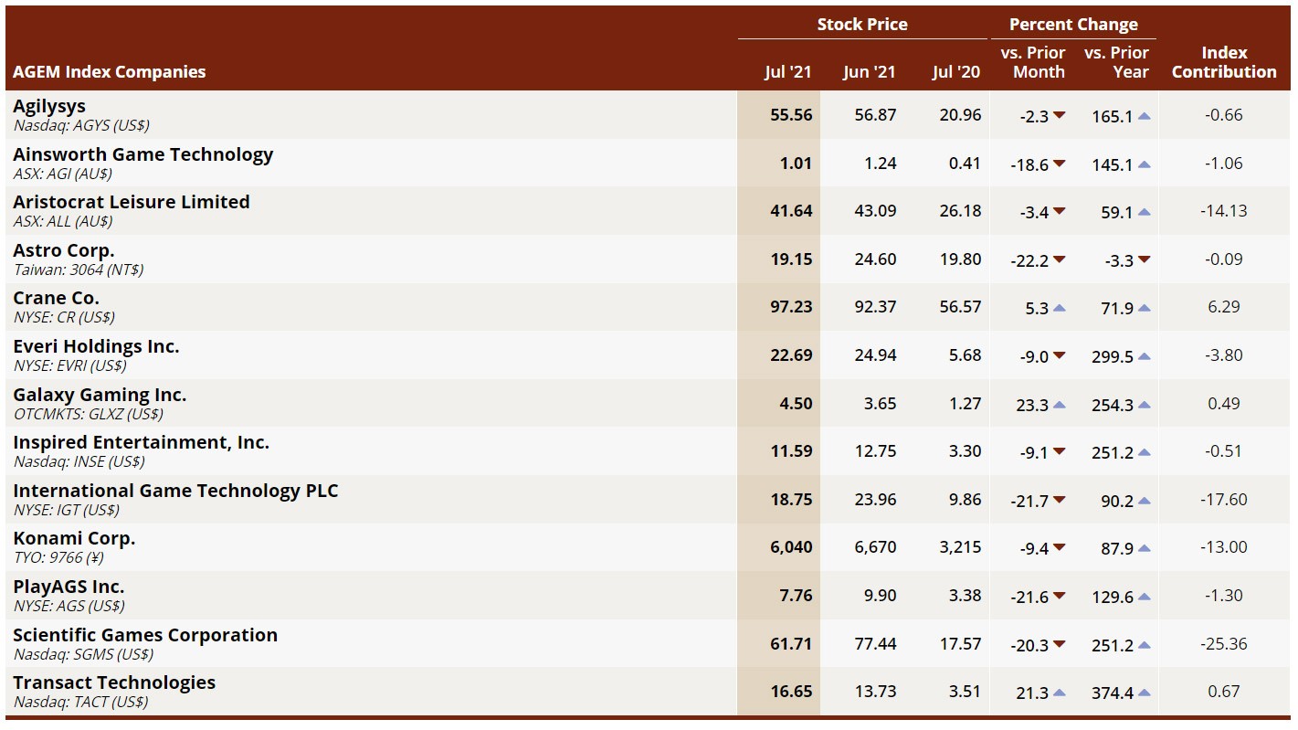 n July 2021, the AGEM Index reported its first decline in eight months after falling 7%, or 70.06 points to 925.32 points from June. However, from a year-over-year perspective, the index remained up 504.46 points (+119.9%).