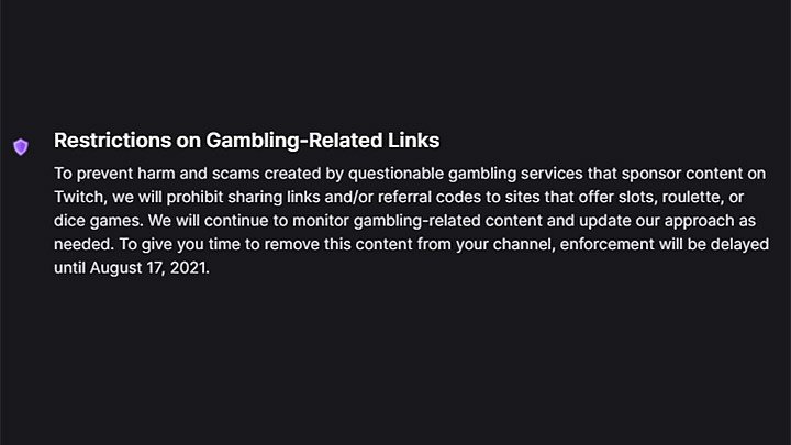 Starting past Tuesday, August 17, the live streaming platform started banning gambling-related links and referral codes after announcing it in a Creator Update, in order to “prevent harm and scams created by questionable gambling services that sponsor content on Twitch.”