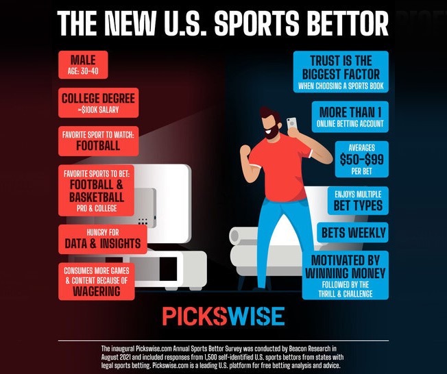 new study by U.S. platform for betting analysis and advice Pickswise.com examines the behaviors, habits and preferences of the American sports bettor. The national demographic and psychographic survey was conducted by Beacon Research for Pickswise among 1,500 self-identified U.S. sports bettors residing in states where the activity is legal.