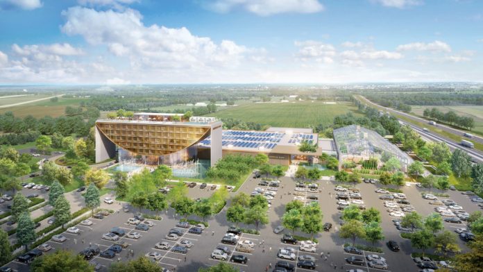 To be developed approximately one hour west of Indianapolis, the property would count with a hotel elevated above an interior greenscape, in a shape resembling a “happy smile.” Most guest rooms would be located on upper levels, enjoying extended views.