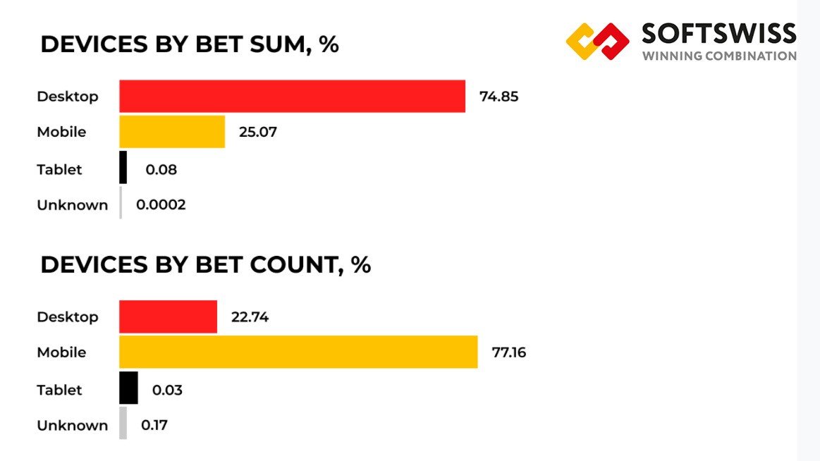 However, statistics change when it comes to number of bets placed: users favor mobile devices, 77.16% versus 22.64% for desktop, which is mostly used for larger bets, but less often. “The greater bet count made via mobile devices is due to the accelerating pace of life,” explained Kamenetskyi.