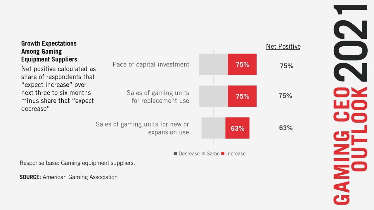 Optimism is also present among gaming suppliers. Over the next six months, 75% expect sales of gaming units for replacement use to increase, and 63% expect sales of new units to improve.