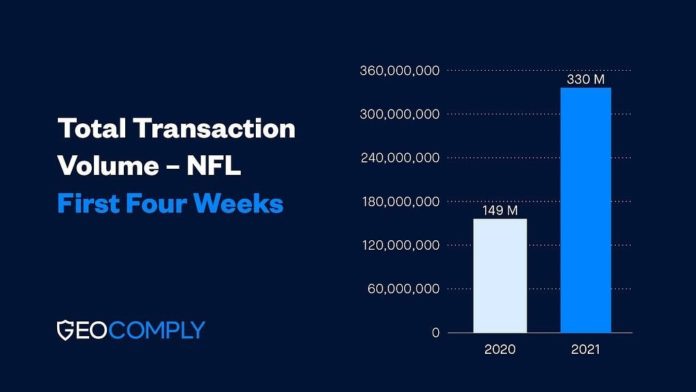 According to the data collected and analyzed by GeoComply, there were 330 million geolocation transactions across 18 states and the District of Columbia for the first four weeks of the season, ending Sunday October 3.