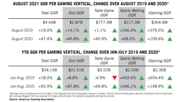 he U.S. gaming industry’s record-setting pace continued into August, reports the American Gaming Association (AGA). According to AGA’s Commercial Gaming Revenue Tracker, combined revenue from traditional casino gaming, sports betting, and iGaming reached $4.44 billion, up 19% from August 2019.