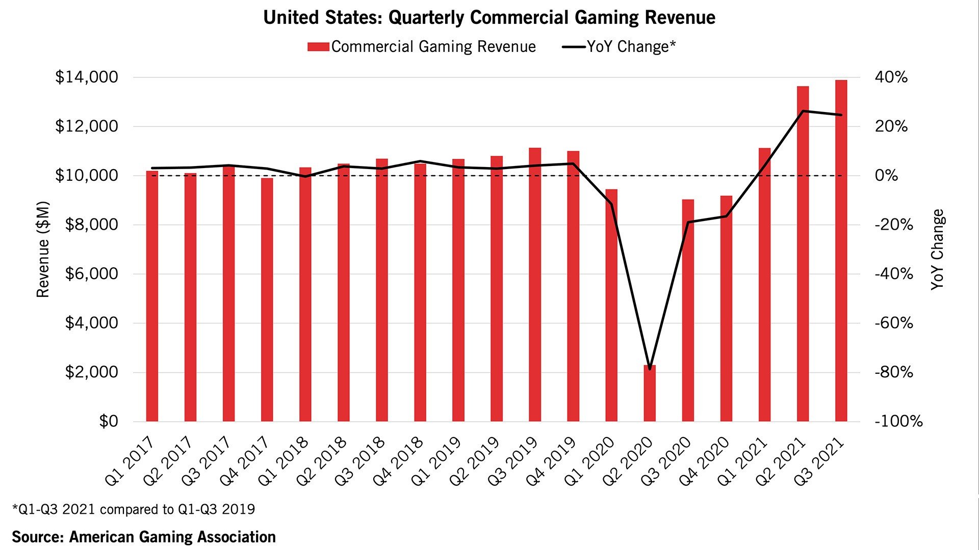 merican Gaming Association announced on Tuesday that nationwide commercial gaming revenue has reached a new quarterly record of $13.89 billion in Q3, 2021, according to AGA’s Commercial Gaming Revenue Tracker. The new high marks the second consecutive quarter of record U.S. commercial gaming performance.