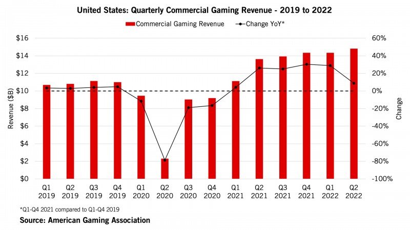 The US gaming industry keeps breaking records. Nationwide commercial gaming revenue for the second quarter totaled $14.8 billion, according to the American Gaming Association’s (AGA) Commercial Gaming Revenue Tracker. Despite the growth rate softening throughout the period, the amount still sets a new quarterly all-time high for the industry, beating Q4 2021 by 3.3%.