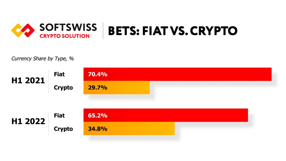 When it comes to currency, holding 34.8% of the total bets volume in H1 2022, digital coins continue to capture a significant share of all bets made. Crypto betting has increased by 5% compared to a year ago.