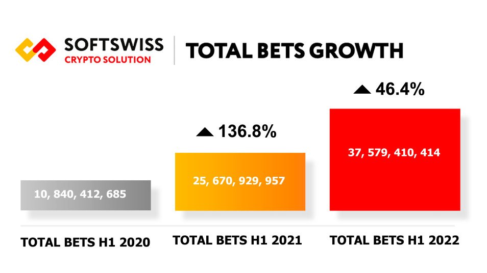The general iGaming market continues to surge, with the sum of all bets -fiat and crypto- showing a 46.4% rise compared to the first half of 2021. Compared to the same period in 2020, the number increased by almost 247%.  According to SOFTSWISS, this confirms that interest in iGaming “is steadily increasing year by year.”
