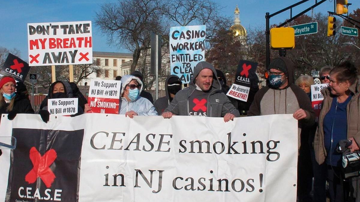 Irate that the session to discuss the proposed smoking ban was snuffed out, casino workers and patrons opposed to smoking in gaming halls held a protest outside the meeting Thursday. About 100 people rallied in the rain underneath a walkway outside Hard Rock AC, demanding the state Legislature act on a bill that has the support of more than half of state lawmakers and Gov. Phil Murphy, but which has been stalled without a hearing in a Senate or Assembly committee.