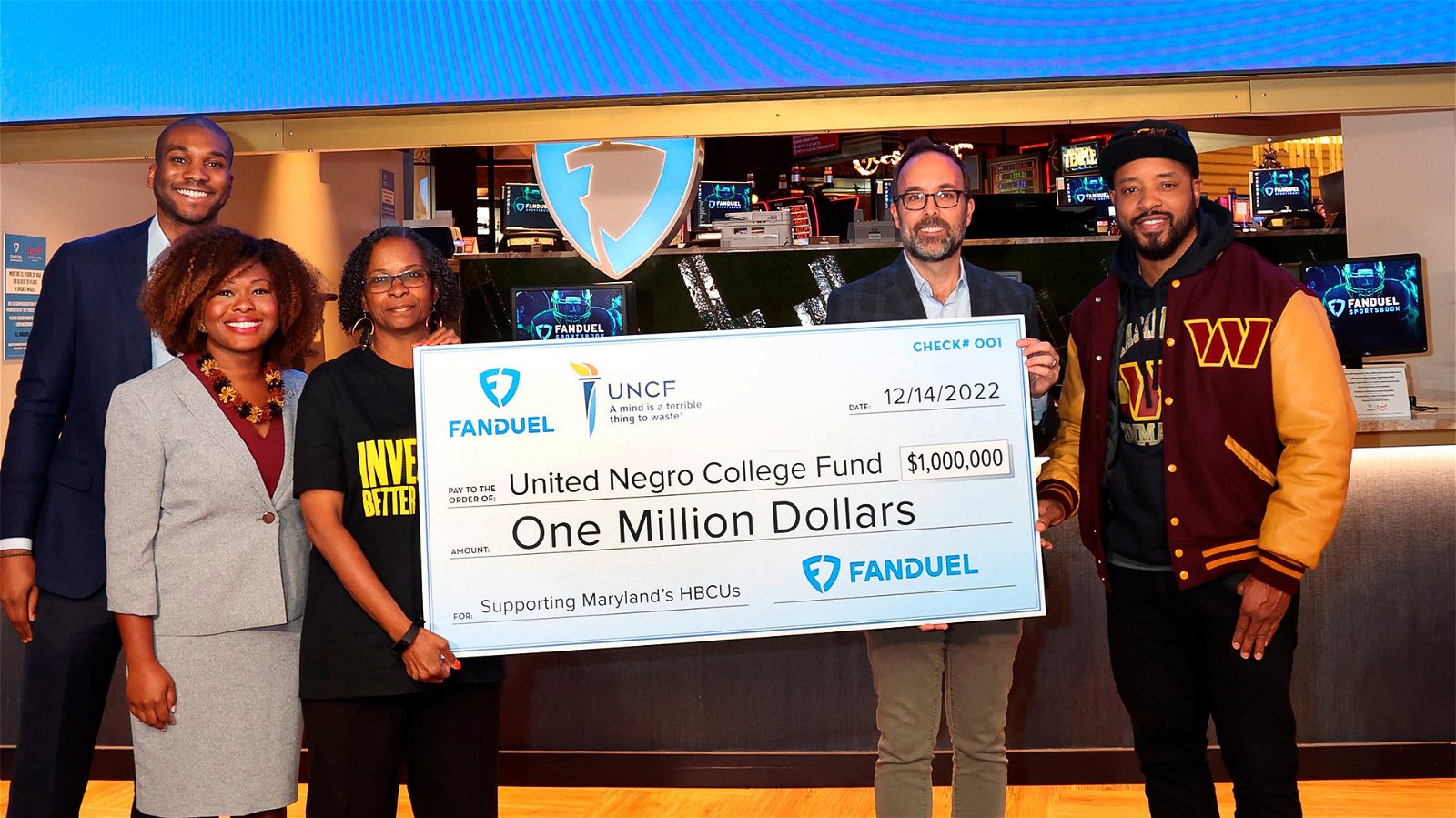 FanDuel officially made the donation in the form of a check presentation. The event took place at the FanDuel Sportsbook at Live! Casino & Hotel in Hanover. Former Washington Commanders wide receiver Santana Moss, along with UNCF and FanDuel executives, took part in the ceremony.