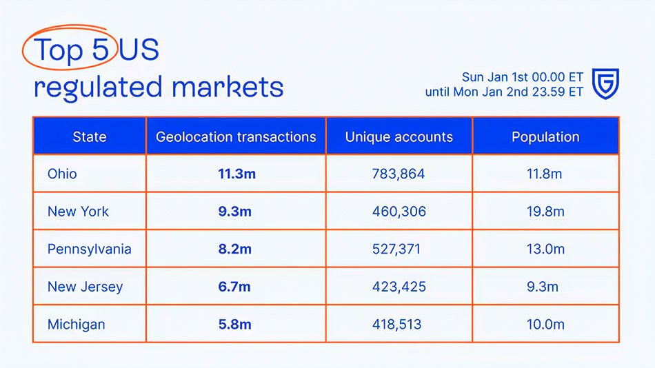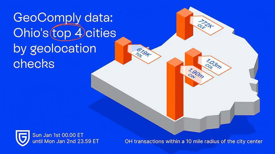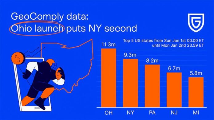 According to geolocation and anti-fraud solutions provider GeoComply, Ohio was the busiest regulated market in the US over the New Year’s holiday weekend, recording 11.3 million geolocation transactions through January 1 and 2.