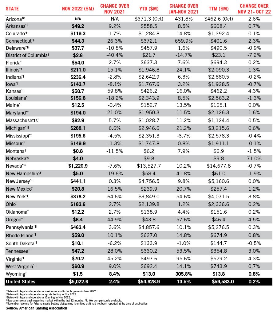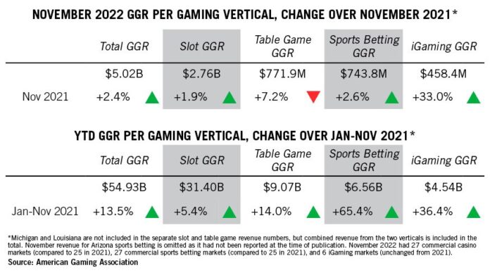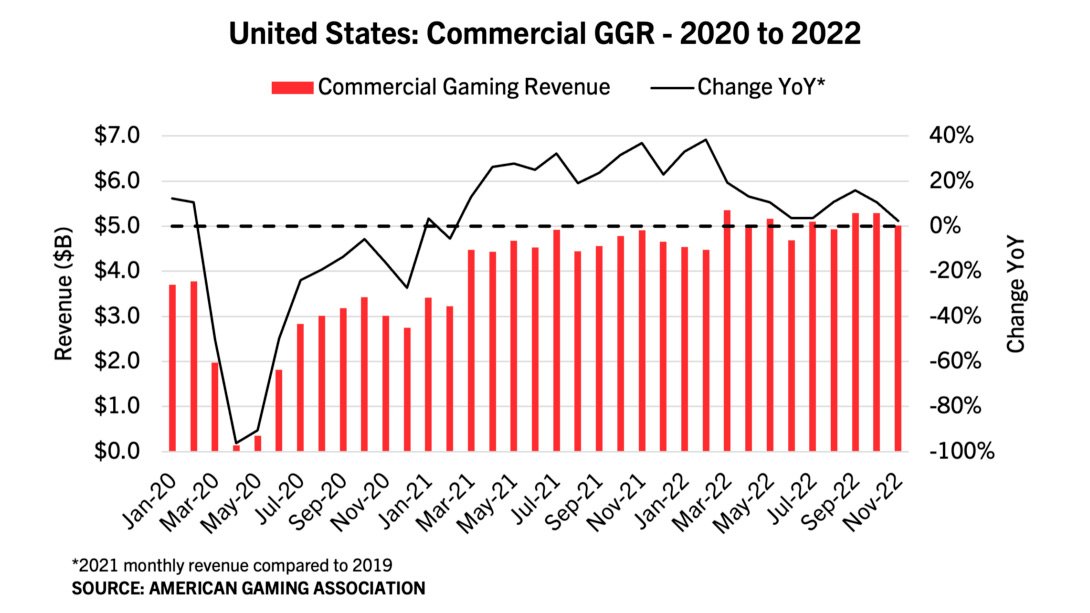 The figures were unveiled Thursday, as part of AGA’s Commercial Gaming Revenue Tracker. The monthly report features state-by-state and nationwide financial performance data with breakdowns for individual gaming verticals, in this case for November 2022’s gaming revenue.