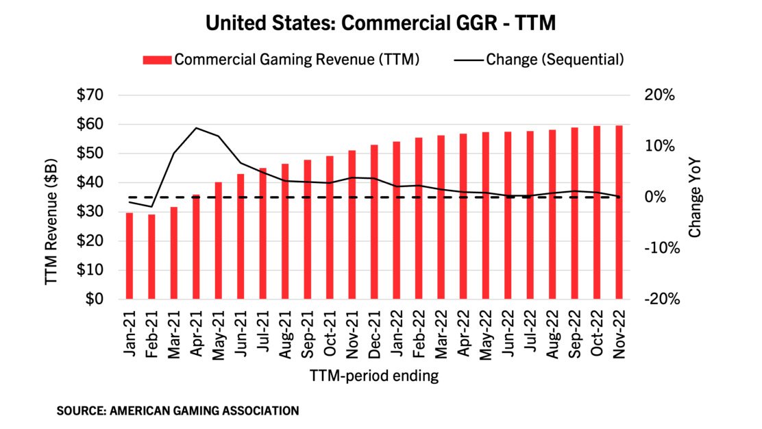 Trailing 12-month (TTM) revenue was $59.58 billion for the period covering December 2021 through November 2022. Sequentially, TTM revenue inched up 0.2% compared to the preceding TTM period stretching from November 2021 to October 2022. The near-flat TTM trend is unsurprising considering the commercial gaming industry has been back to operating at full capacity without pandemic restrictions for more than a year.