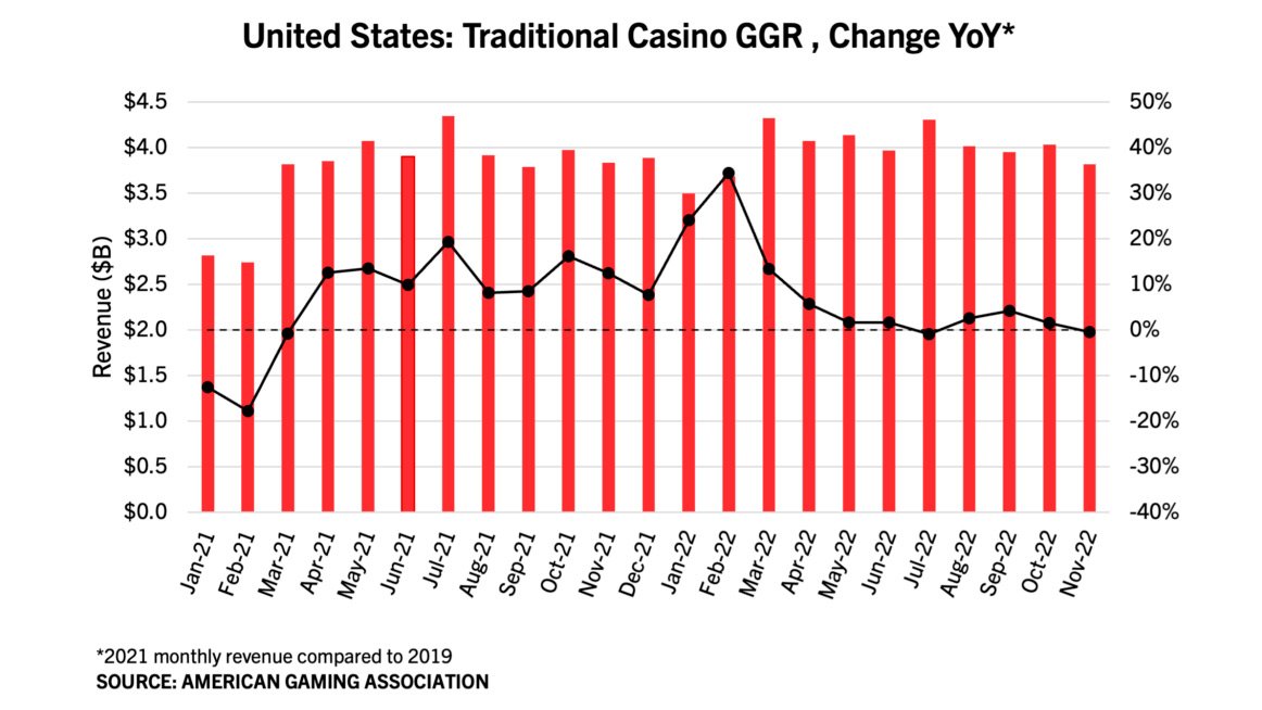 Through the first 11 months of 2022, commercial gaming revenue stood at $54.93 billion, 13.5% ahead of the same period in 2021. The US gambling industry has already surpassed the annual record of $53.04 billion in 2021 with one month of gaming revenue left to report.