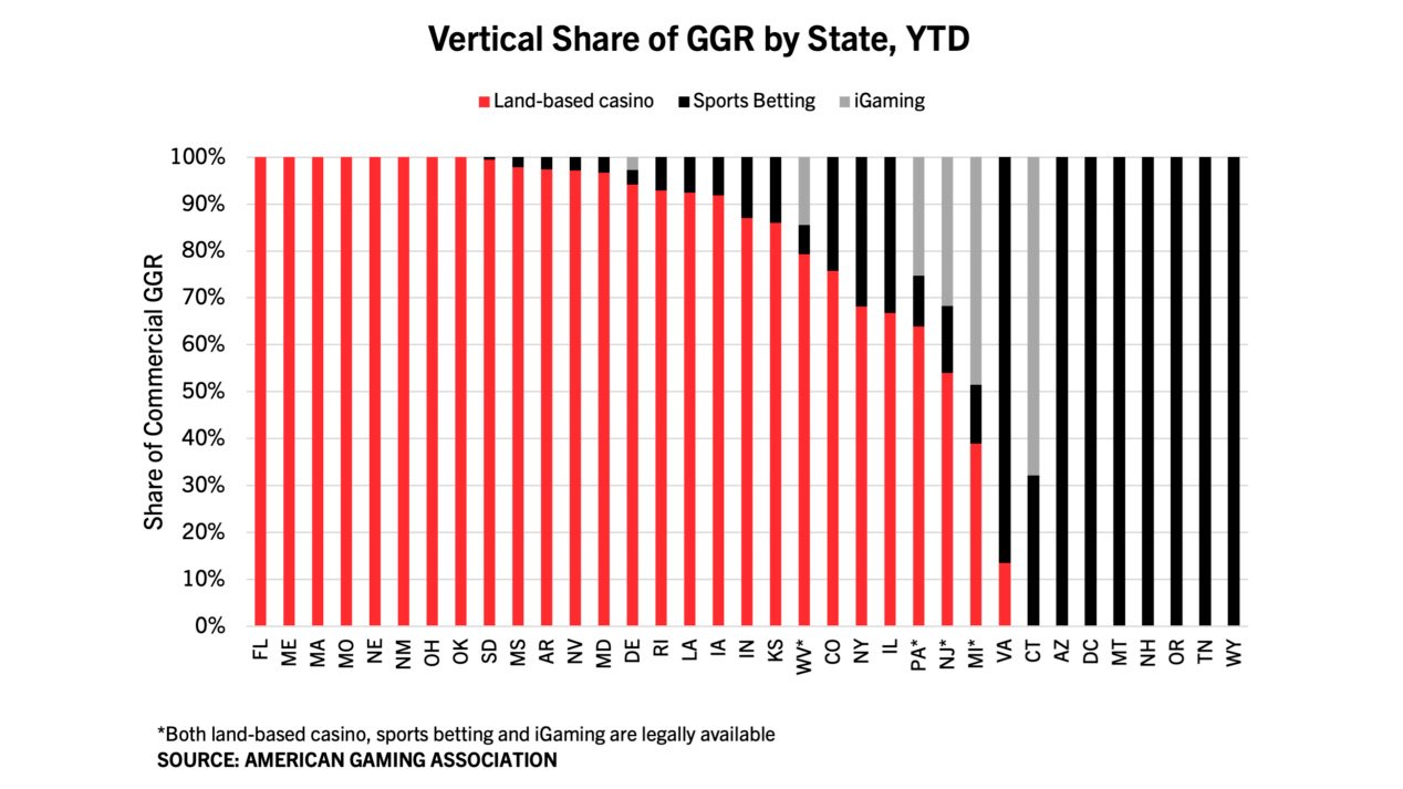 At the state level, commercial gaming revenue dispersion across verticals varies considerably. In the four states where all three verticals are legally available (including online sports betting) – Michigan, New Jersey, Pennsylvania, and West Virginia – the combined share of sports betting and iGaming range between 20.7% in West Virginia to 61% in Michigan.